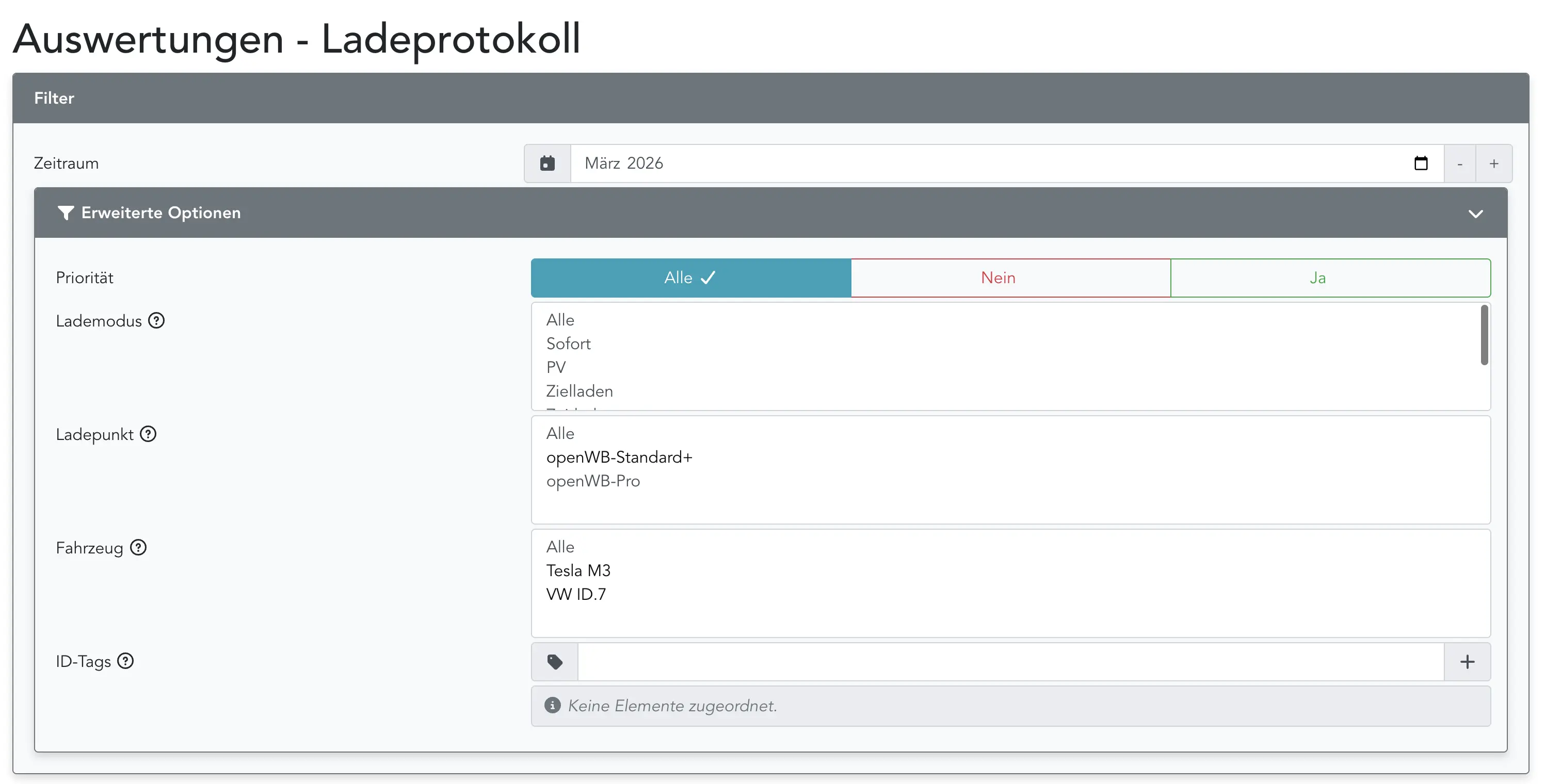 Des Weiteren sind vielfältige Filtermöglichkeiten nach Fahrzeug, Lademodus, Ladepunkt sowie ID-tags integriert, die eine schnelle Wunsch-Zusammenstellung der Abrechnung ermöglichen. Diese kann im Anschluss als csv-Datei heruntergeladen werden.