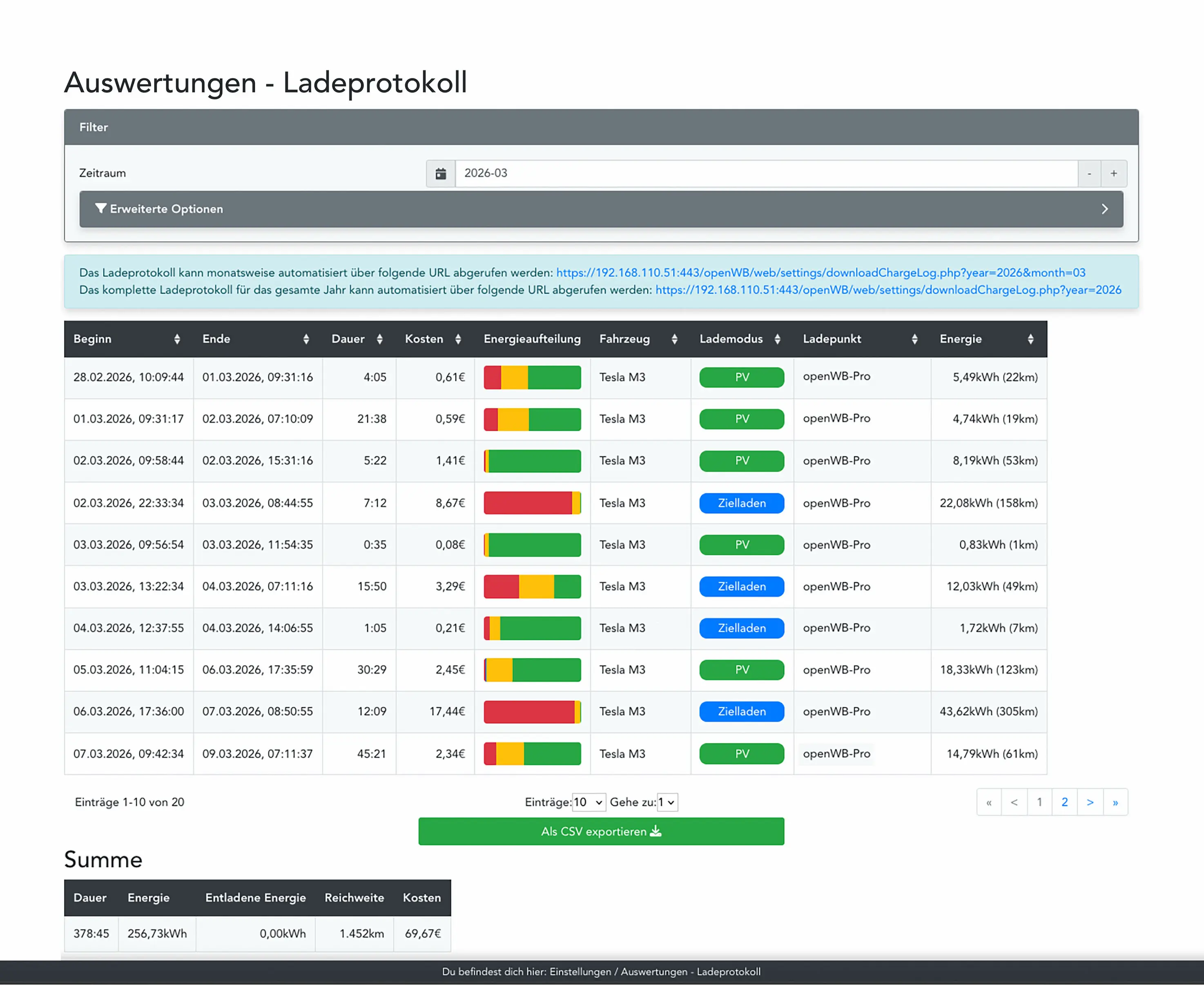 Hierbei werden seit Neuestem auch die Energieanteile für Netzbezug, PV- und Speicheranteile ausgegeben, was eine leichte Kontrolle bezüglich der Wirtschaftlichkeit der jeweiligen Ladung ermöglicht.