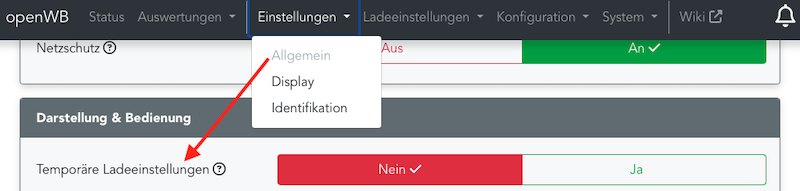 Hier wird eine Auswahl zur Bedienung angeboten, ob Änderungen über die Hauptseite bzw. das Display bei „Ja“ nur als temporäre oder bei „Nein“ als persistente (dauerhafte) Eingaben behandelt werden. Persistent/Dauerhaft (Temporär = Nein) bedeutet, dass die am Ladepunkt getätigten Einstellungen auch nach Abstecken des Fahrzeugs aktiv bleiben. Temporär (Temporär = Ja) bedeutet, dass die am Ladepunkt getätigten Einstellungen nach Abstecken des Fahrzeugs auf die Default-Einstellungen des Lade-Profils zurückgesetzt werden. In den nachfolgenden Punkten werden beide Modi ausführlich und mit Beispielen erklärt.