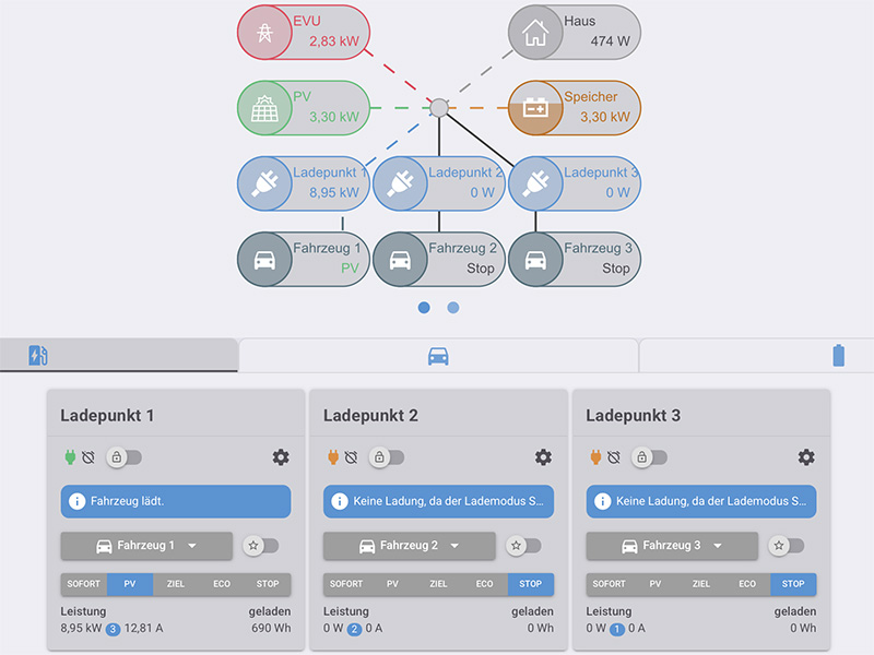 4. Im Lade-Profil ist für das Fahrzeug Sofort eingestellt. Das Fahrzeug steckt gerade an. Am Display wird dann auf PV umgestellt, weil beim nächsten, längeren Sonnenschein mit PV-Überschuss geladen werden soll. Anschließend wird jedoch unter Einstellungen → Konfiguration → Fahrzeuge eine andere Einstellung geändert und gespeichert.