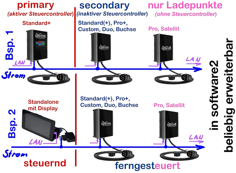 Die openWB-Ladehardware kann einen Steuercontroller beinhalten (z.B. openWB standard+) oder nicht (z.B. der „nur Ladepunkt“ openWB Pro). Es gibt auch den „reinen“ Steuercontroller (openWB Standalone), der keine Ladehardware beinhaltet und nur als „primary“ genutzt wird.