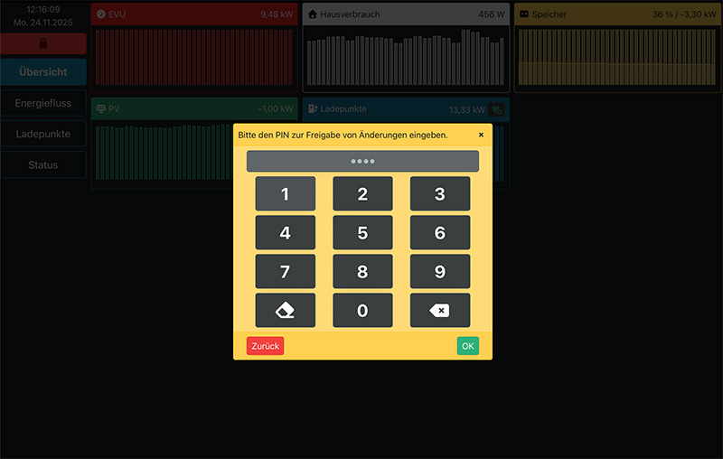 Um einen Missbrauch des Displays vor unbefugter Nutzung zu verhindern, gibt es die Entsperrung mittels PIN-Eingabe auf dem Display. Hier ist eine Zahlenkombination zwischen 4 und 10 Ziffern einzutragen und unten zu Speichern. Zur Nutzung wird 1x auf das ausgeschaltete Display gedrückt, welches bei aktiver Bediensperre ein Tastenfeld anzeigt, in welches der PIN eingegeben und unten rechts mit OK bestätigt wird.