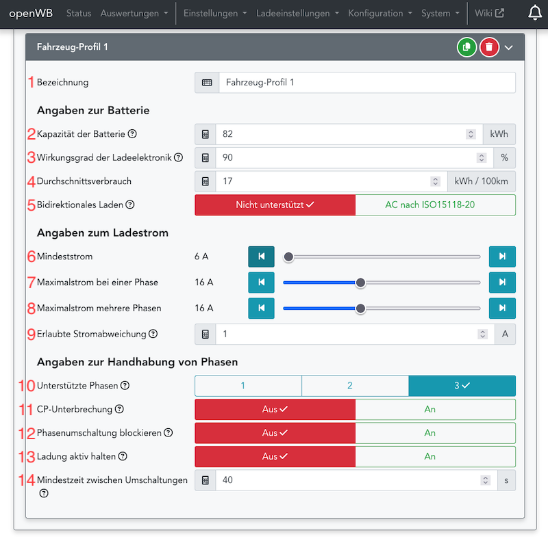 4 & 5: Hier werden Fahrzeug- und Lade-Profil ausgewählt, welche für dieses Fahrzeug gelten sollen. Weitere Information zu Fahrzeug- und Lade-Profil folgen unten.