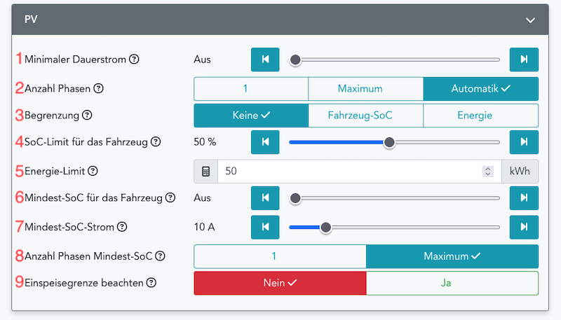 Ziel (Sofortladen) mit Priorität Ziel (Sofortladen) Zeit mit Priorität Zeit Sofort mit Priorität Sofort Eco (Min-Anteil) mit Priorität Eco (Min-Anteil) PV (Min-Anteil) mit Priorität PV (Min-Anteil) Ziel (PV) mit Priorität Ziel (PV) Eco (PV-Anteil) mit Priorität Eco (PV-Anteil) PV (PV-Anteil) mit Priorität PV (PV-Anteil) Bidi-Entladen ohne Priorität Bidi-Entladen mit Priorität
