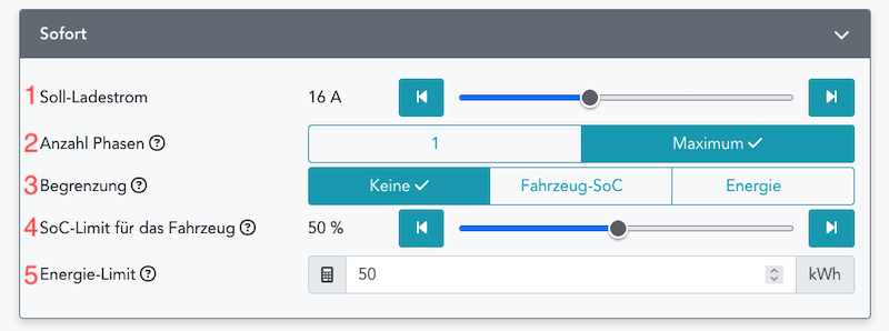 3: Der Lademodus Sofort kann ohne Fahrzeug-SoC-Begrenzung (Aus), mit Begrenzung des Fahrzeug-SoC (SoC) bei konfiguriertem SoC-Auslesemodul oder mittels Vorgabe eine gewünschten Energiemenge in kWh (Energie) genutzt werden.