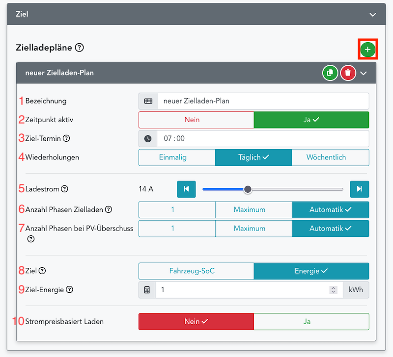 1: Mit diesem Wert wird das Auto mit Strom aus dem Stromnetz geladen, wenn der Strompreis unter die angegebene Preisgrenze (siehe Punkt 6) fällt. Hinzu kommt ggf. vorhandener Strom aus Überschuss (z.B. aus PV-Erzeugung).