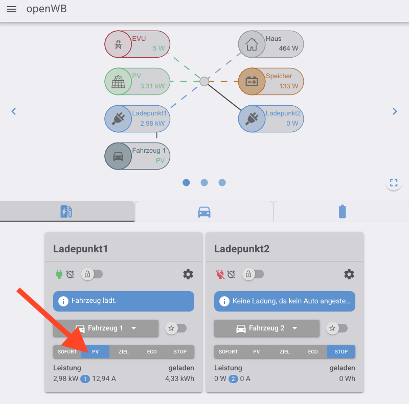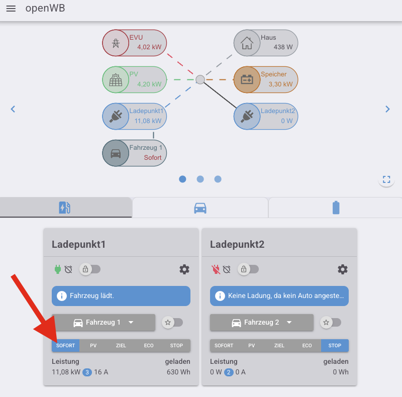 Am ersten Ladepunkt ist für Fahrzeug 1 der Lademodus Sofort aktiv (dorthin zeigt der rote Pfeil). Im Energiefluss-Diagramm über den Ladepunkten sieht man, dass die Ladeleistung von Fahrzeug 1 mit 11 kW zu etwa 4 kW von der PV versorgt wird, 3 kW werden aus dem Hausspeicher entladen und weitere 4 kW werden aus dem Stromnetz bezogen (die gestrichelten Linien bewegen sich mit der Richtung des Stromflusses, hier im Bild nicht zu sehen). Zusätzlich zur Ladeleistung von ca. 11 kW des Fahrzeugs ziehen andere Stromverbraucher im Haus auch noch einmal ca. 440 Watt.