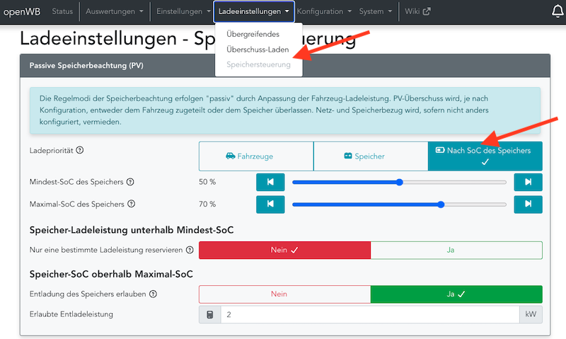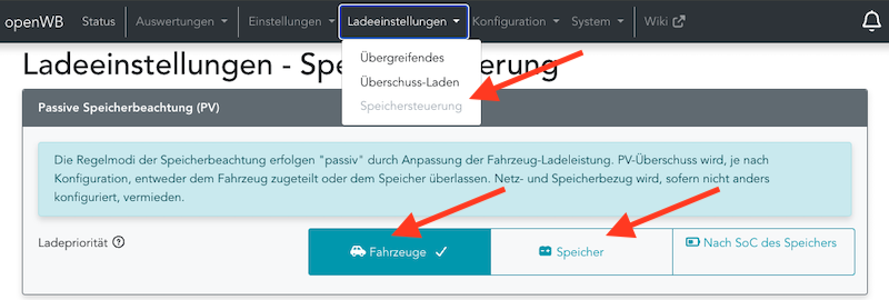 Will man ohne Unterstützung eines heimischen Stromspeichers PV-Überschuss laden, kann man in der passiven Speicherbeachtung unter Einstellungen - Ladeeinstellungen - Speichersteuerung eine der zwei Optionen Fahrzeuge oder Speicher wählen: