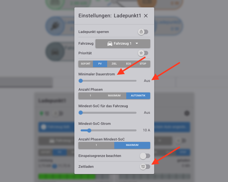 Auch die Lademodi Zeitladen und Minimaler Dauerstrom, die im Lademodus PV aktiviert werden können, können eine Speicherentladung verursachen. In den Einstellungen des Lademodus PV (zu erreichen über das Einstellungs-Symbol oben rechts in der Ladepunkt-Kachel → s. screenshot) sind die besagten Funktionen deaktiviert:
