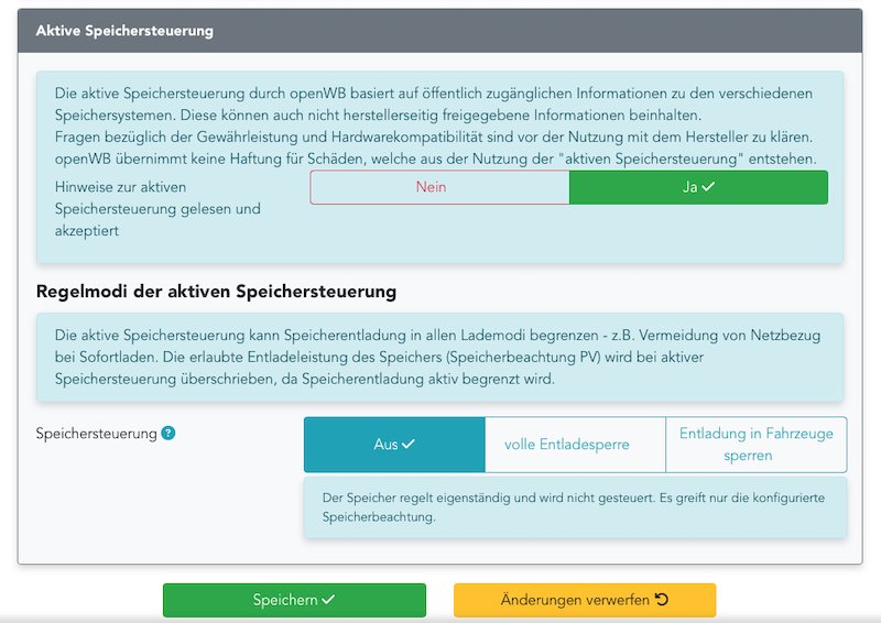 Die aktive Speichersteuerung setzt voraus, dass der Hersteller eine offene Schnittstelle geschaffen hat, über welche die openWB den Speicher direkt ansteuern kann.