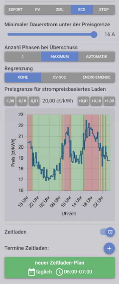 - Eco-Laden Es wird ohne Lade-Ziel, nur mit günstigem dyn. Strompreis, geladen. Die openWB berechnet anhand der individuell einstellbaren Preisgrenze, in welchen Zeitfenstern geladen wird. Hierbei wird die eingestellte Stromstärke und Phasenanzahl genutzt. Des Weiteren können EV-SoC oder Energiemenge als Begrenzung eingestellt werden.