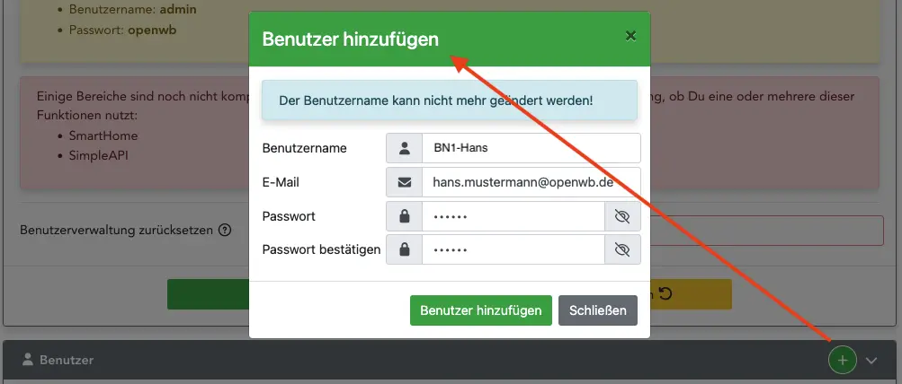 • neue Benutzer anlegen → mit „+“ im Kopf der aufgeklappten Karte Benutzer analog zu Ladepunkten, Fahrzeugen etc.