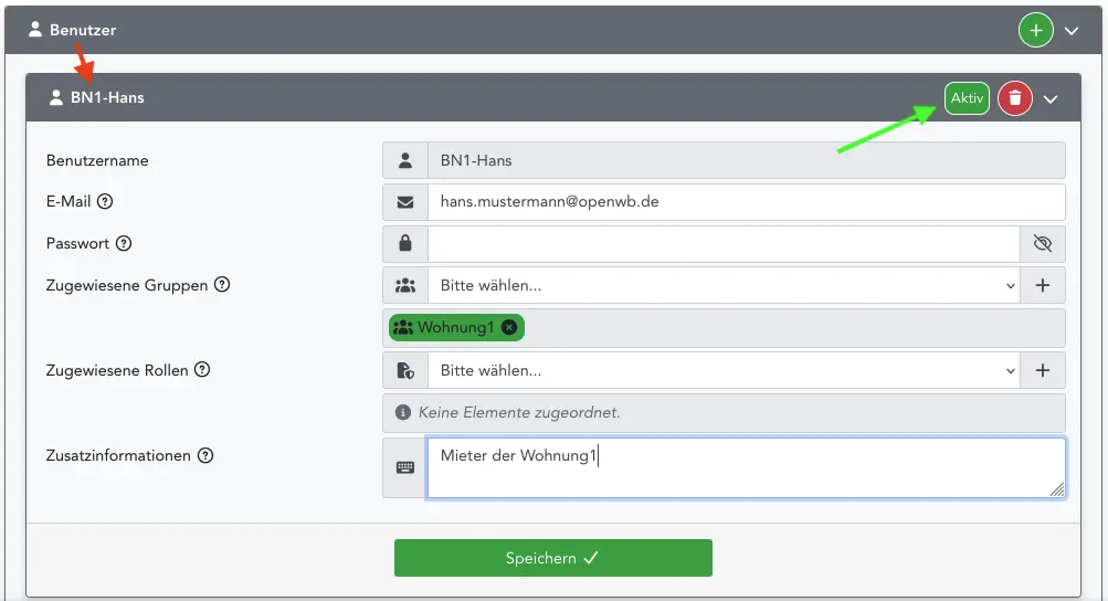 Im Anschluss wird den Nutzern die jeweilige Gruppe (Wohnung) zugewiesen. Hier am Beispiel des Nutzers BN1-Hans. Speichern nicht vergessen!