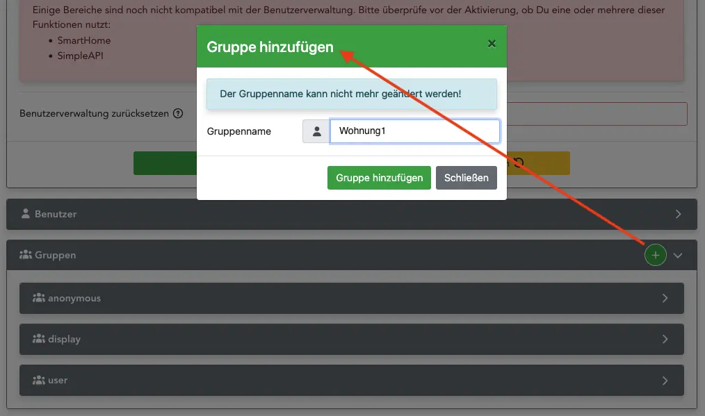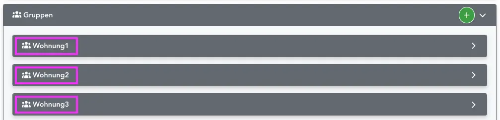 Zuerst werden unter Gruppen 3 individuelle Gruppen mittels +Zeichen (rechts) für die 3 Wohnungen angelegt: