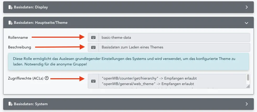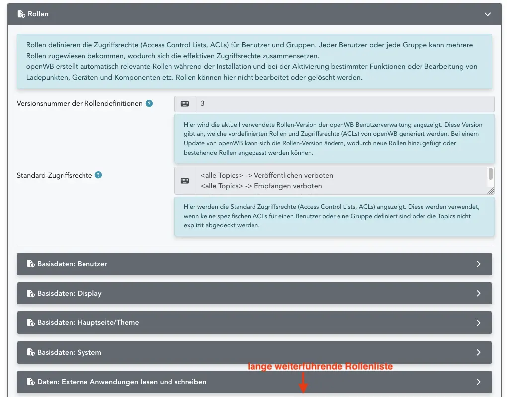 • Die Gruppe anonymous kann mit weiteren oder allen Rollen für Daten erweitert werden, sodass alle Daten eingesehen und Ladepunkte bedient werden können.