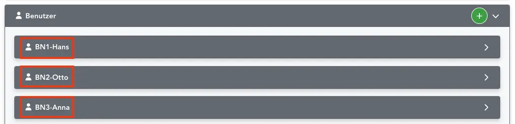 Nun werden die 3 Bewohner unter Nutzer mittels +Zeichen (rechts) angelegt.