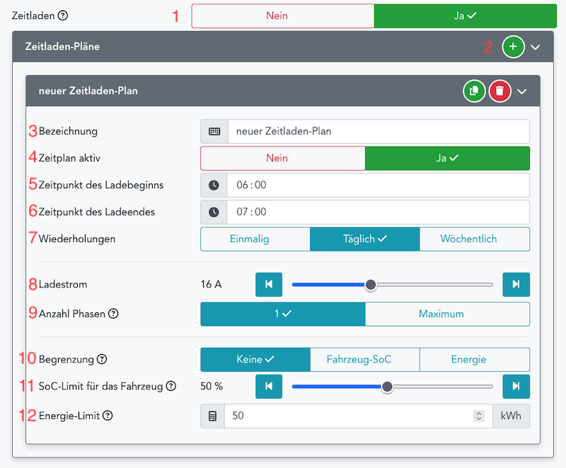 4: Ob dieser spezielle Zeitlade-Plan aktiv sein soll, wenn der Lademodus Zeit allgemein aktiviert wurde (Punkt 1).